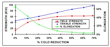 The degree of cold reduction determines the strength of a metal. As the percent cold work increases, so does the strength. Conversely, the total elongation decreases as cold work increases. Figure 3 shows the relationship between strength, elongation and cold work for yellow brass. If the percent cold work increases past a certain point, there are diminishing returns on strength. This is because at higher reductions, there are fewer free dislocations to become entangled. Also, the elongation (ductility, formability) decreases rapidly with cold work. Since the material is less able to plastically deform, fracture becomes much more likely.